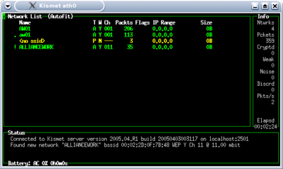 Ferramenta de sniffer de redes sem fio, atualmente na versão Kismet-2005-08-R1 de 15